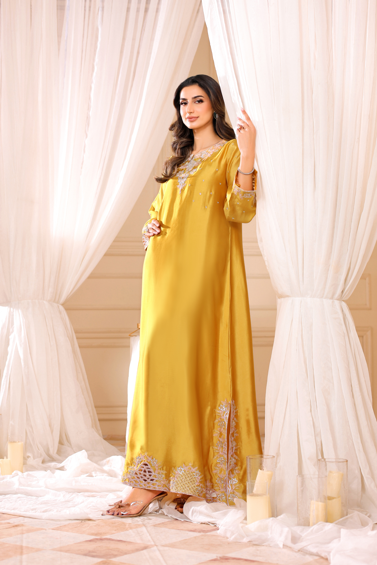 This exquisite mustard kaftan from feya luxe pret collection epitomizes refined sophistication with its flowing ,graceful silhouette. Crafted from a lustrous fabric that drapes elegantly, the ensemble is adorned with intricate powder pink threadwork and silver embellishments, accentuating the neckline, sleeves and hemline. The meticulously hand-embroidered floral and geometric motifs lend an opulent charm, while subtle side slits enhance fluidity and movement. A perfect blend of timeless luxury and modern finesse, the outfit is ideal for both formal and celebratory occasions